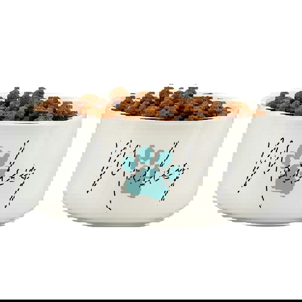 Our blue paw print pet bowl can be personalised with a name up to 12 characters.