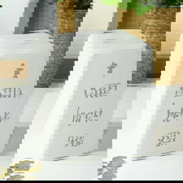 This personalised money box can be personalised with up to 2 lines of text on the front of the box.