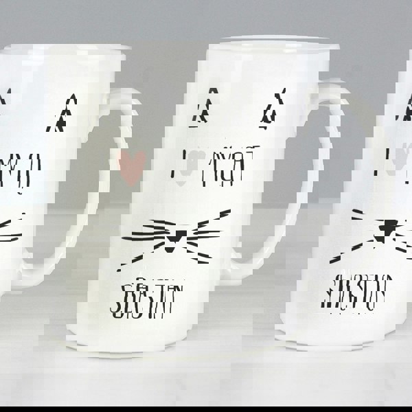The words on the front of this Cat Whiskers Mug, 'I (heart symbol) MY CAT' are fixed. You can then add a name up to 20 characters in length. On the reverse you can add a message over 4 lines of text up to 25 characters per line.