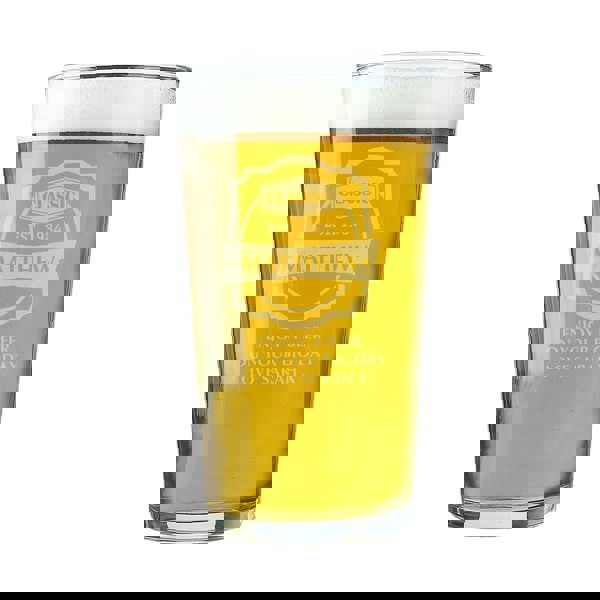 Personalise this Classic Pint Glass with a year up to 4 characters, a name up to 12 characters, and a message over 3 lines up to 15 characters per line.