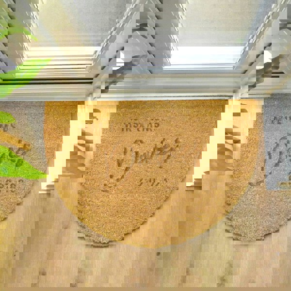 This coir, non-slip half moon doormat can be personalised with three lines of text, as below
