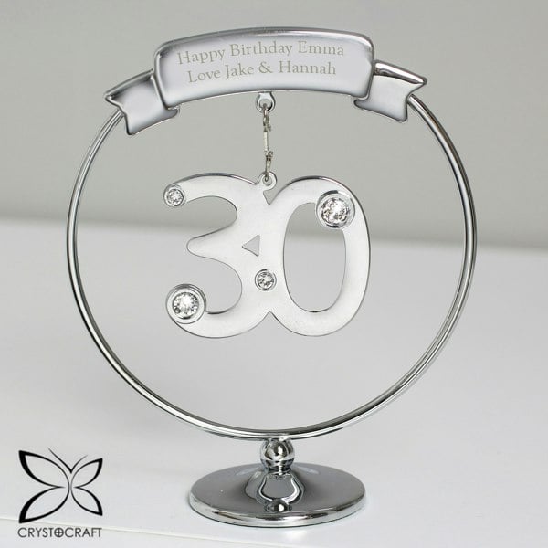 Mark their 30th Birthday or Wedding Anniversary with this elegant Crystocraft ornament. Dangling from a personalised round silver stand is a crystal clad 30. This will catch the light and bring a smile to the recipients face.