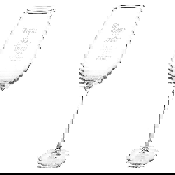 You can personalise this wine glass with a name up to 12 characters in length. You can then add a message below up to 3 lines of text, 20 characters per line. All personalisation is case sensitive and will appear as entered.