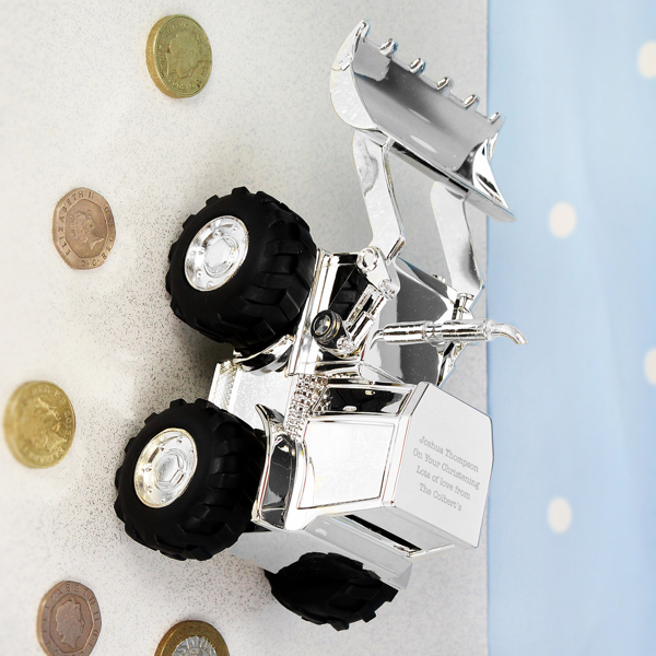 This silver plated Digger Money Box can be personalised on the back with any message over 4 lines and up to 20 characters per line.