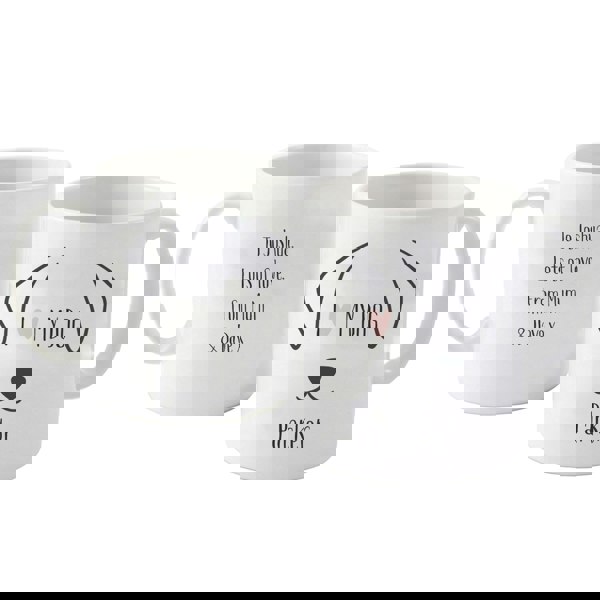 The words on the front of this Dog Features Mug, 'I (heart symbol) MY DOG' are fixed. You can then add a name up to 20 characters in length. On the reverse you can add a message over 4 lines of text up to 25 characters per line.