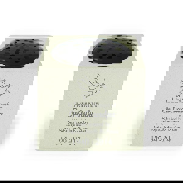 Personalise this Dove Memorial Vase with 1 line up to 25 characters, a name or role up to 12 characters, and a further 3 lines of up to 20 characters for a message and a date.