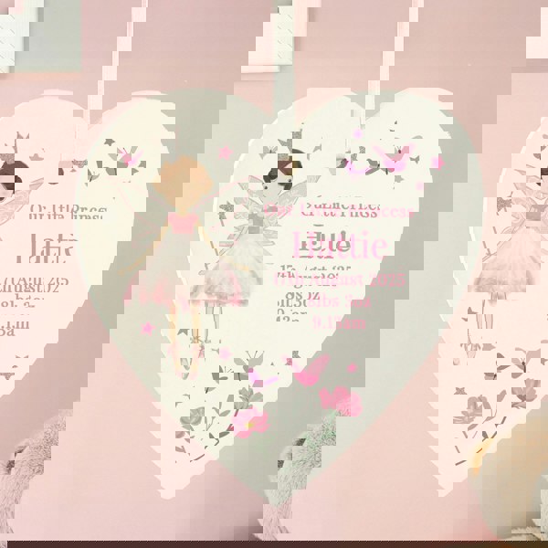 Personalise this Fairy Princess Wooden Heart Decoration with up to 5 lines of text, as below