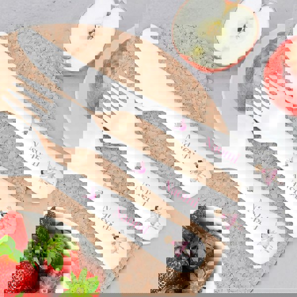 This practical 3 piece set of plastic cutlery featuring the toadstool fairy design can be personalised with any name up to 12 characters in length.