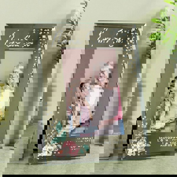 This stunning personalised floral 4x6 diamante glass photo frame features a gentle mirrored effect and results in a beautiful way to display a photograph.