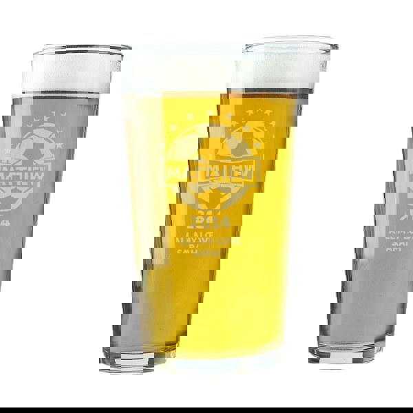Personalise this Football Pint Glass with a Name up to 12 characters and a year. , A message can also be added over two lines, 15 characters per line.