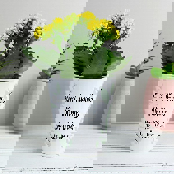 You can personalise this pot with up to 4 lines of text, line 1 has up to 20 characters available and line 2 has 12 characters available. Lines 3 & 4 have up to 15 characters available.