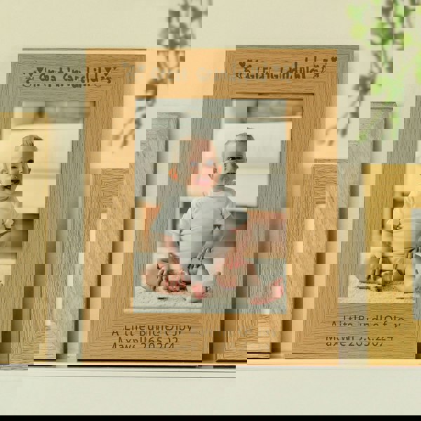 Personalise this Great Grandchild 7x5 portrait frame with a message over 2 lines of 30 characters per line. The words 'Great Grandchild' is fixed. All personalisation is case sensitive and will appear as entered.