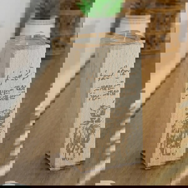 Add a unique touch to the rustic Highland Cow design with a personalised message over 3 lines, as below