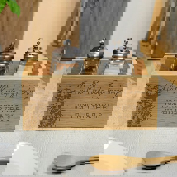 To the left side of the crate, there's a lovely engraved Highland cow design, adding a fun rustic touch that makes it extra special.