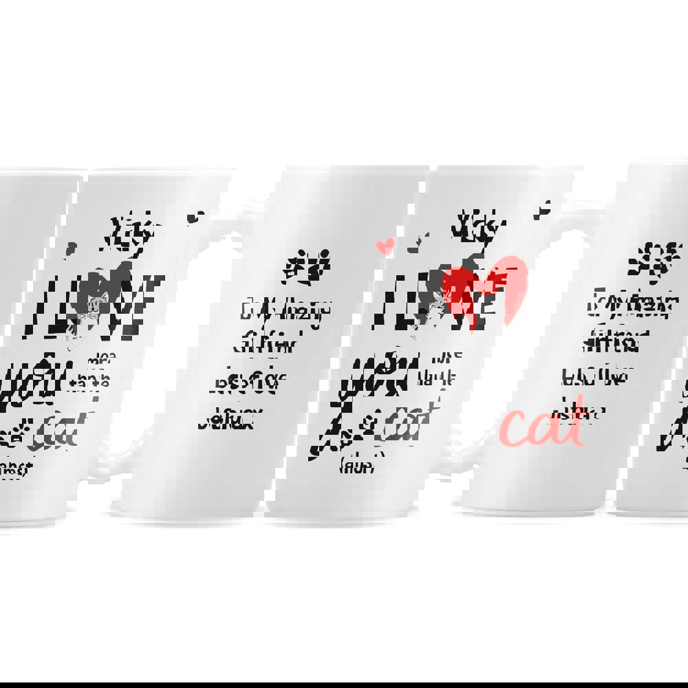 This cute personalised mug features the text "I love you more than the cat" to the front, high praise for a partner who knows how much you love your feline friend!