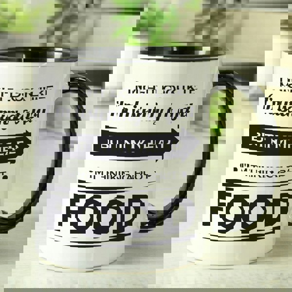You can personalise this mug with 2 lines of text under the fixed text "I might look like I am listening to you but in my head"