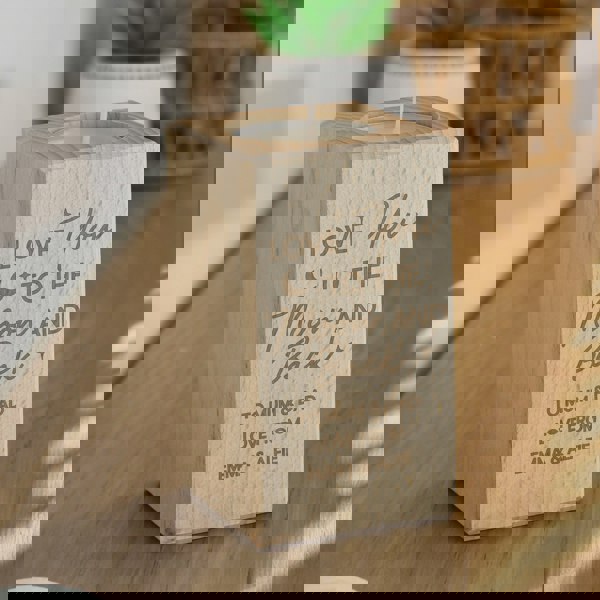 Create a warm glow and an even warmer heart with our beautifully crafted Personalised Love You To The Moon Wooden Tealight Holder.