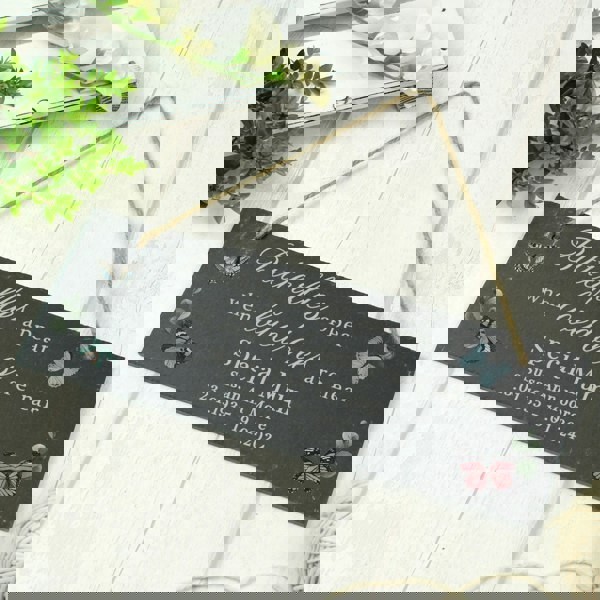 Personalise this slate with up to 3 lines of 25 characters beneath the fixed text, "Butterflies appear when loved ones are near"