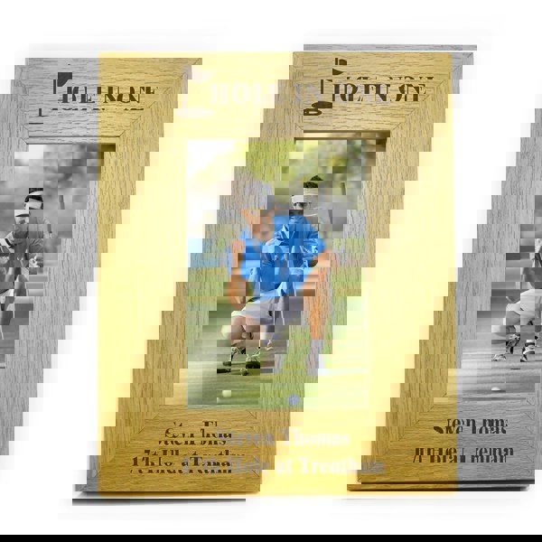 Personalise this 4x6 Oak Finish Golf Frame with 1 line of a text above the photo of up to 15 characters and 2 lines of 25 characters below the photo.