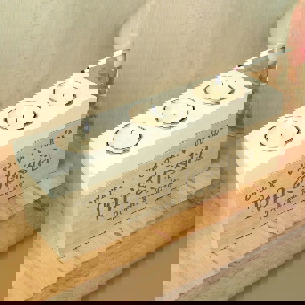 The tea light box can be personalised with 2 lines of text with up to 25 characters per line.