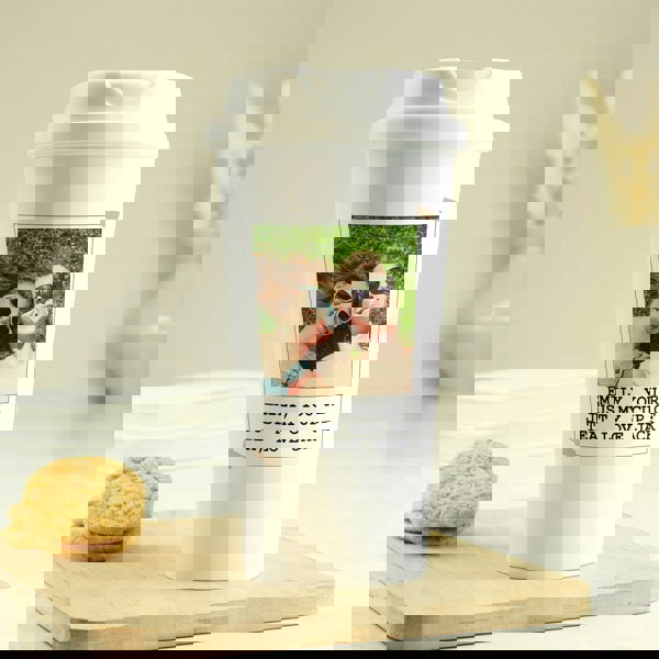 You can add an image to this travel mug as well as up to 3 lines of text with up to 15 characters per line beneath.