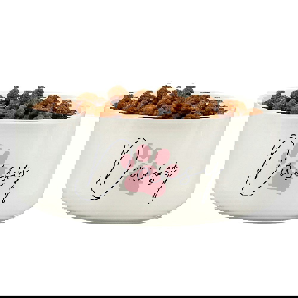 Our pink paw print pet bowl can be personalised with a name up to 12 characters.