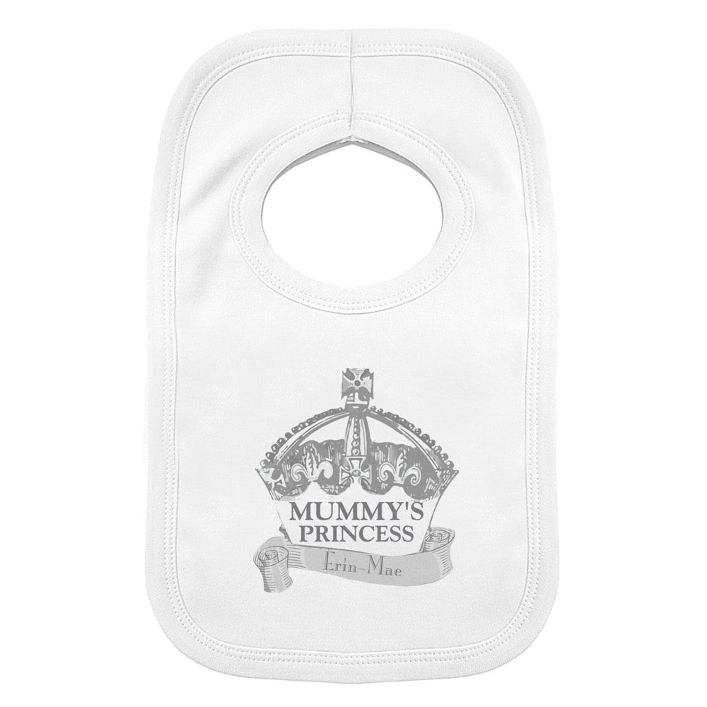 Personalise this Royal Crown Baby Bib over lines 1 & 2 of up to 12 characters per line. Line 3 up to 8 characters.