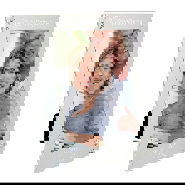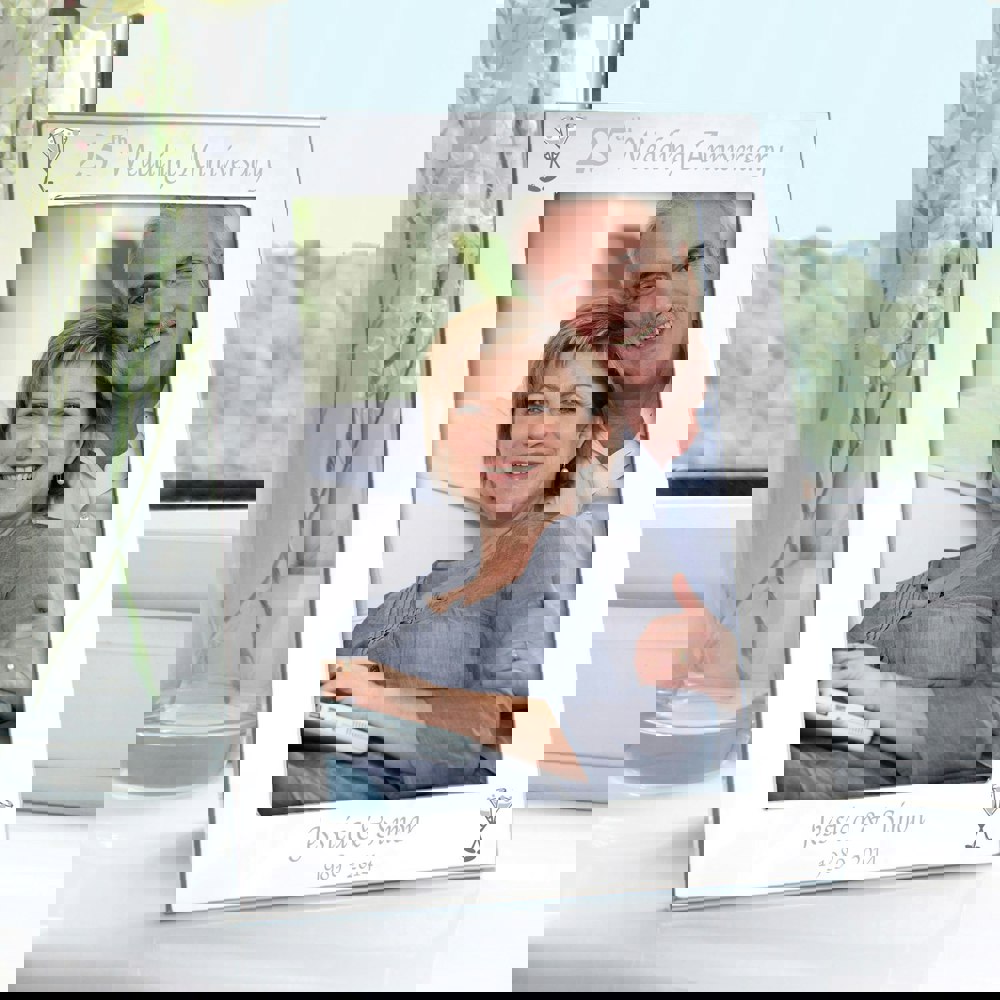 Personalise this silver 5x7 25th Wedding Anniversary photo frame with any message over 2 lines at the bottom of the frame, up to 25 characters each.