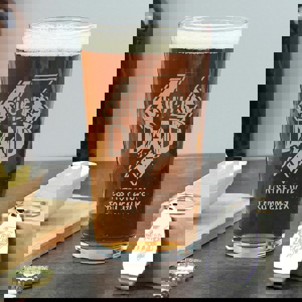 The pint glass proudly displays the fixed text "Super Dad" and can be personalised with a special message using two lines of up to 15 characters each below the design.