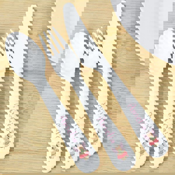 This practical 3 piece set of plastic cutlery featuring the toadstool fairy design can be personalised with any name up to 12 characters in length. All personalisation is case sensitive and will appear as entered.