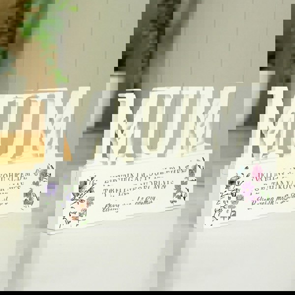 This charming keepsake is delicately crafted from wood and adorned with a vibrant array of wildflower illustrations, symbolising the natural beauty and love of a Mother's heart.