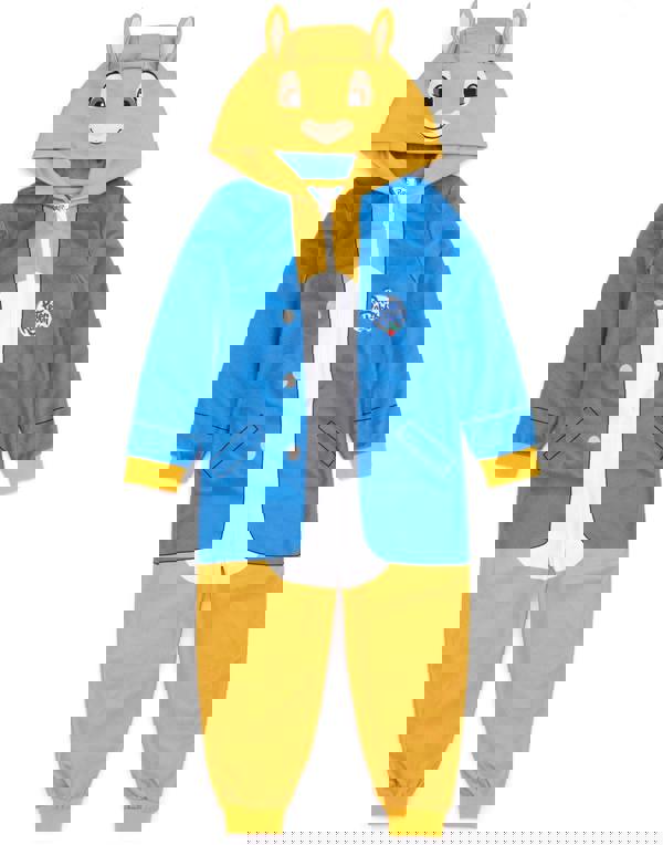 Settle in for relaxed evenings with the Peter Rabbit Boys Multicoloured Character Onesie, an officially licensed all-in-one loungewear style. Finished in blue and brown, it has Peter Rabbit on the hood with 3D ears for a playful character look. A hooded neck and cuffed sleeves complete the cosy shape, while the zip closure keeps dressing simple.