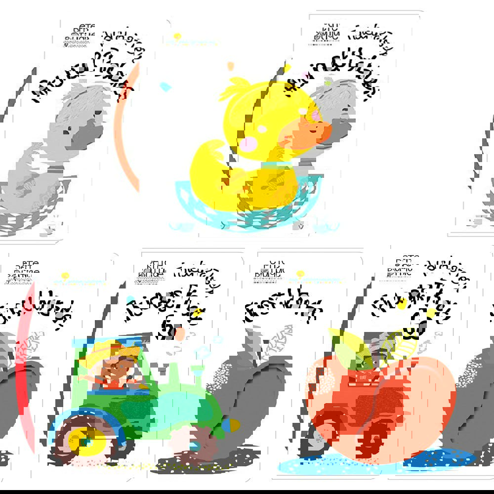 Across the collection, each spread pairs clear images with touch-and-feel elements for little hands. The books introduce everyday themes including vehicles, first words and baby animals, with straightforward labelling alongside the artwork.