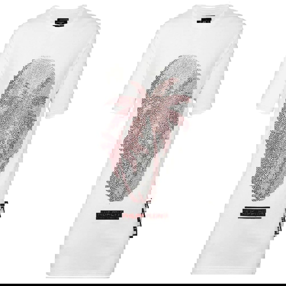 Elevate your wardrobe with the Philipp Plein Large Skull Motif White T-Shirt, a bold statement piece that blends luxury with edgy style.