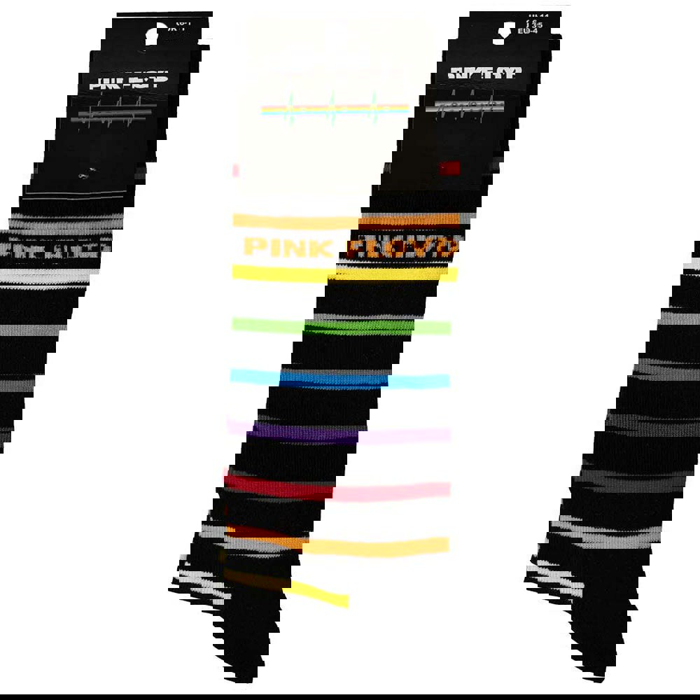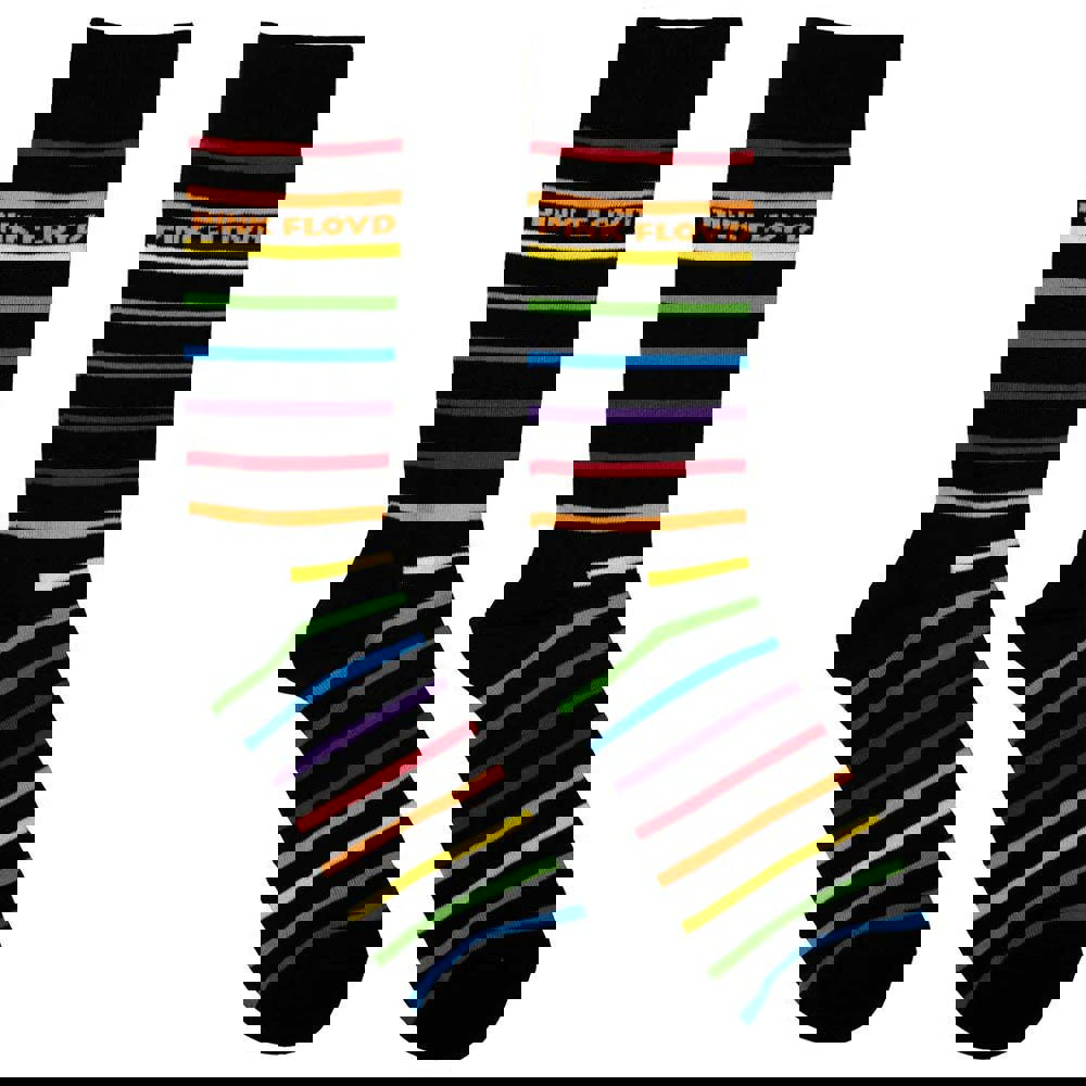 Official licensed Pink Floyd Unisex Ankle Socks featuring the 'Prism Stripes' design motif. These high quality Ankle Socks are available in a black colourway. These premium quality, colourful, all-over pattern cotton rich woven socks are guaranteed to stand out in the crowd.