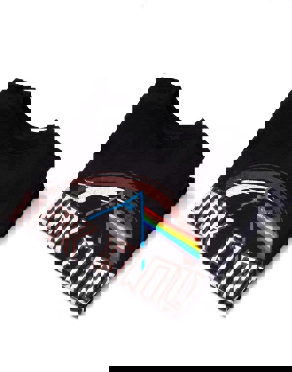 The children's music tee comes in black with short sleeves and a crew neck style that features distressed artwork from the group's iconic album "Dark Side of the Moon."