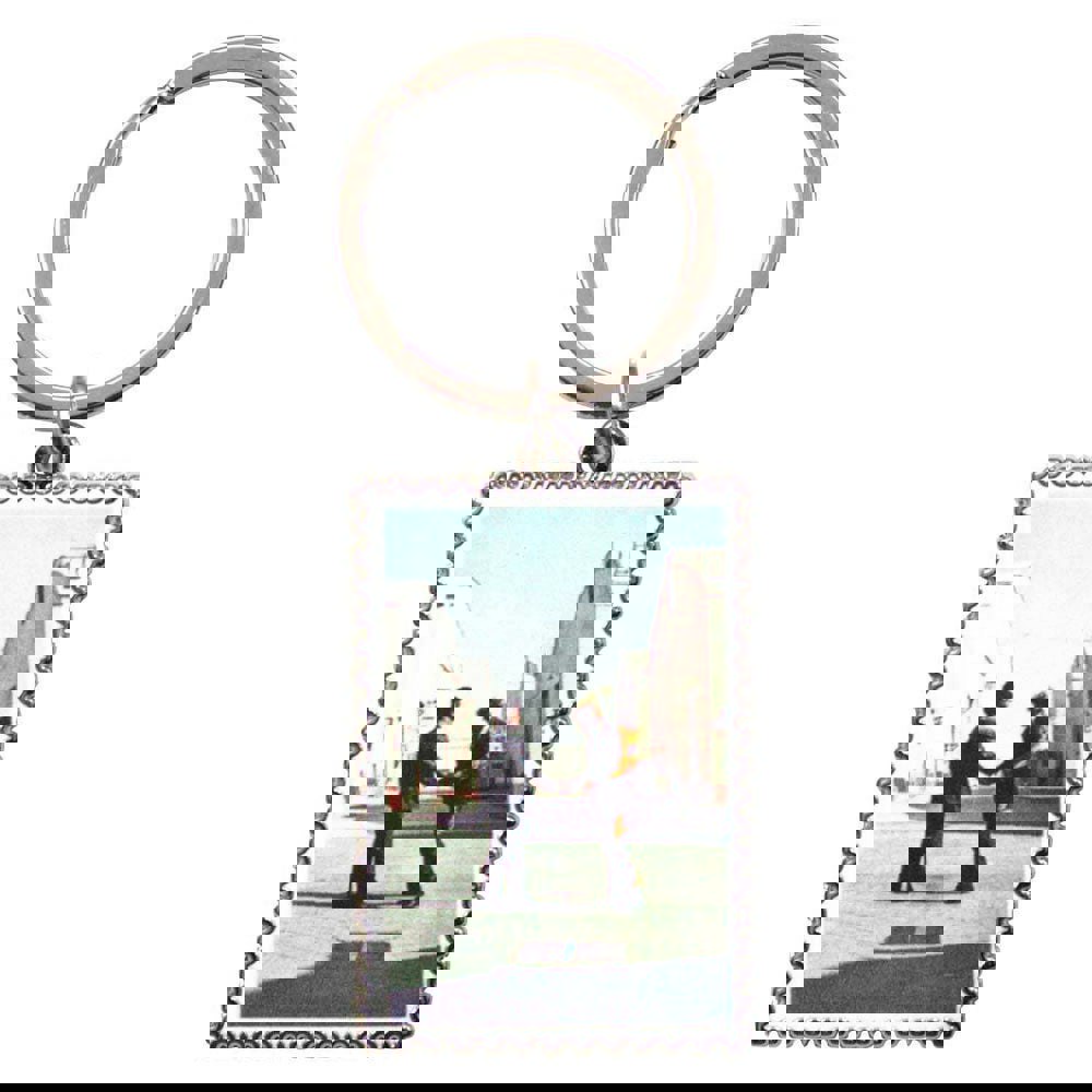 Official licensed Pink Floyd Keychain featuring the 'Wish You Were Here Stamp' design motif. High quality keychain featuring sticker style printed design with epoxy covering and nickel plating. With 30mm split ring integral keychain. 30mm split ring integral keychain.