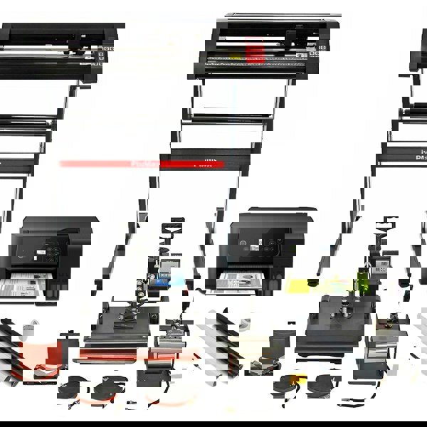 From PixMax, this heat press, vinyl cutter and sublimation printer bundle brings together the core equipment for creating vinyl and sublimation designs, with a set-up that suits serious hobbyists as well as new or expanding businesses. Alongside the heat press, the bundle includes a vinyl cutter designed for controlled feeding and accurate cutting, plus a printer supplied with refillable sublimation cartridges to adapt it for sublimation ink printing.