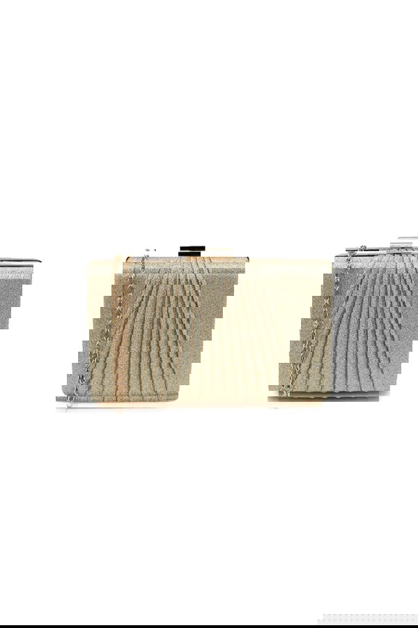 This stylish clutch bag features a sleek glitter finish with a pleated front design, adding a touch of sophistication to any look.