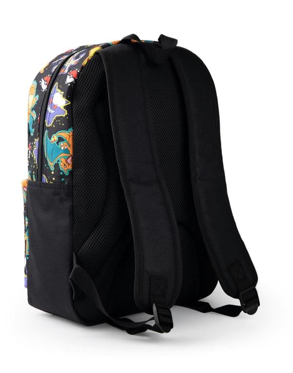 Introducing the Pokémon Pikachu Charizard Gengar Meowth Backpack in Black, a functional companion designed for boys