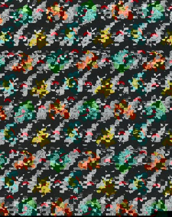 The bold and detailed design features the original starter Pokemon, Bulbasaur, Squirtle, Charmander, and Pikachu in a bold repeated print with great attention to detail