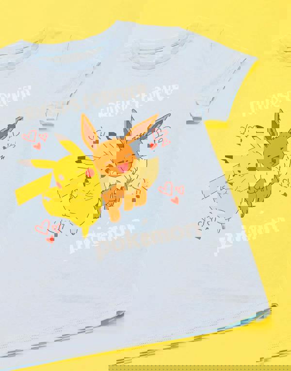 Combine some Pikachu and Eevee fun into your wardrobe with this adorable pastel blue Pokemon t-shirt for girls