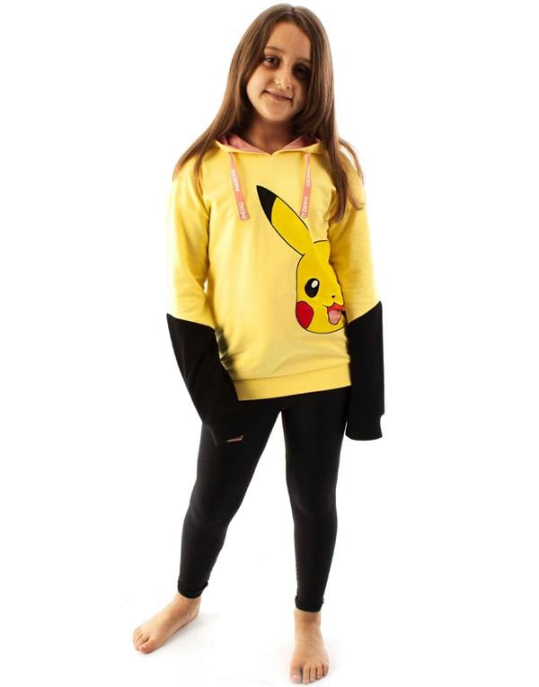 This long sleeve sweater makes the perfect Pokemon gift! The yellow Pokemon hoodie features the instantly recognisable character, Pikachu, with a cheeky winking expression in bold contrasted with striking black detailed sleeves, finished with a super cute pink hood and adjustable pink hood drawstrings that feature a 'PIKACHU' print, perfect for keeping warm during those colder days