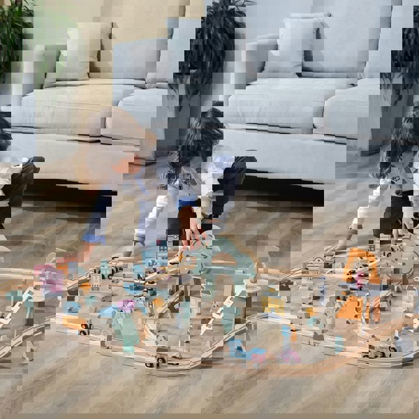 The set comes with multiple colourful train cars and adorable animal characters, perfect for sparking imaginative storytelling. It also includes a range of charming accessories like buildings, trees, road signs, and vehicles to create a vibrant, bustling town scene.
