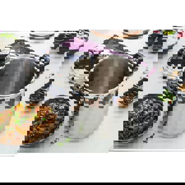 The airtight design traps steam inside the pan, building pressure to cook food quickly while locking in nutrients and flavour. Ideal for busy households, meal prep or family cooking, the generous 6 litre capacity can serve approximately 8 to 10 portions in one go.