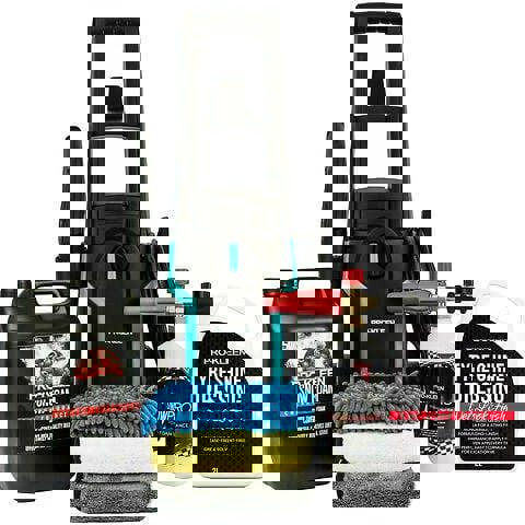 An aluminium water pump is built to resist rust and corrosion, and the carbon brush motor delivers a maximum flow rate of up to 408L/hr for consistent performance. Supplied as a complete kit, it comes with a pressure gun, nozzles, a 5L Cherry snow foam, snow foam lance, 2 microfibre cloths, 1 microfibre mitt, Alloy Foam Cleaner, Trim and Bumper, and 1L Tyre Shine.
