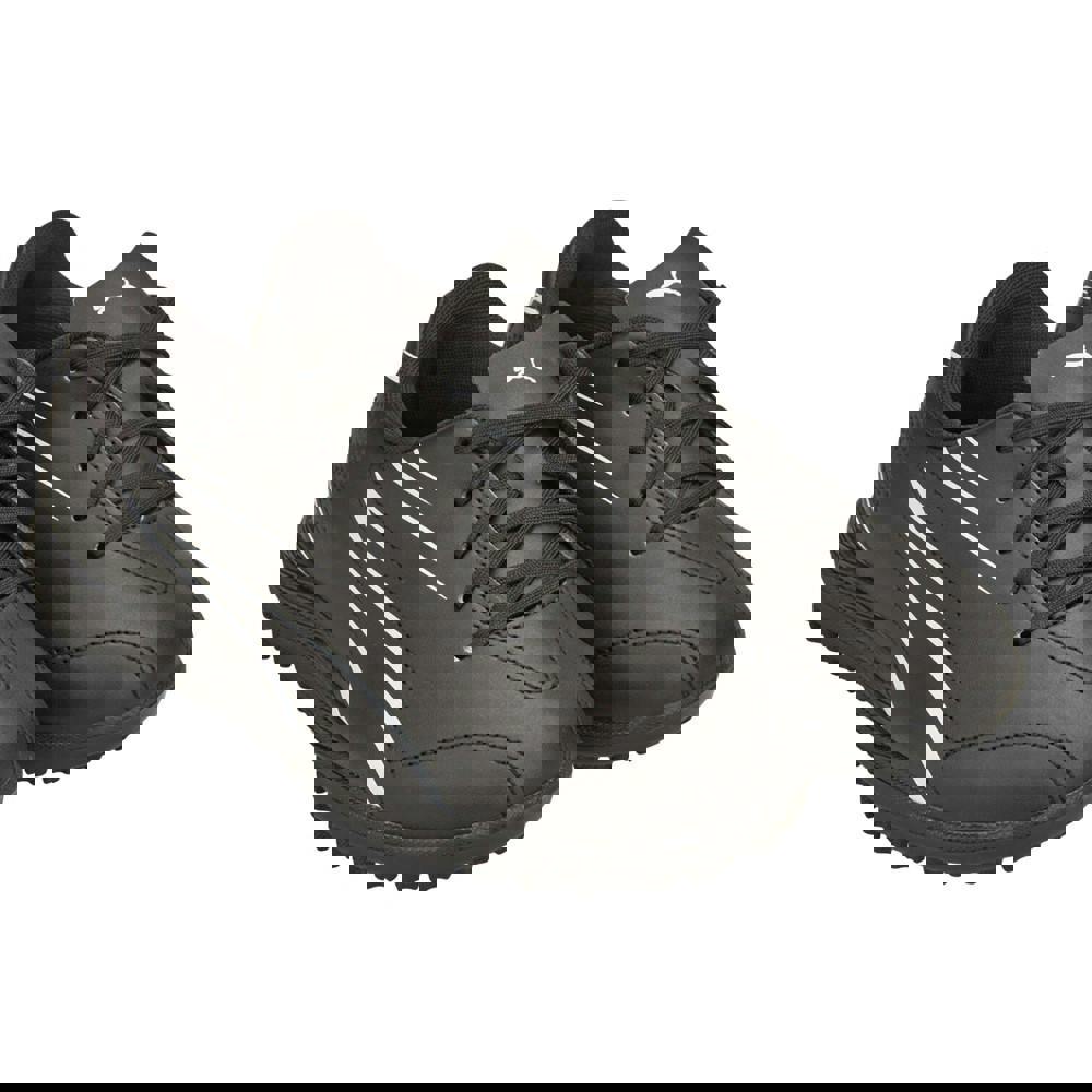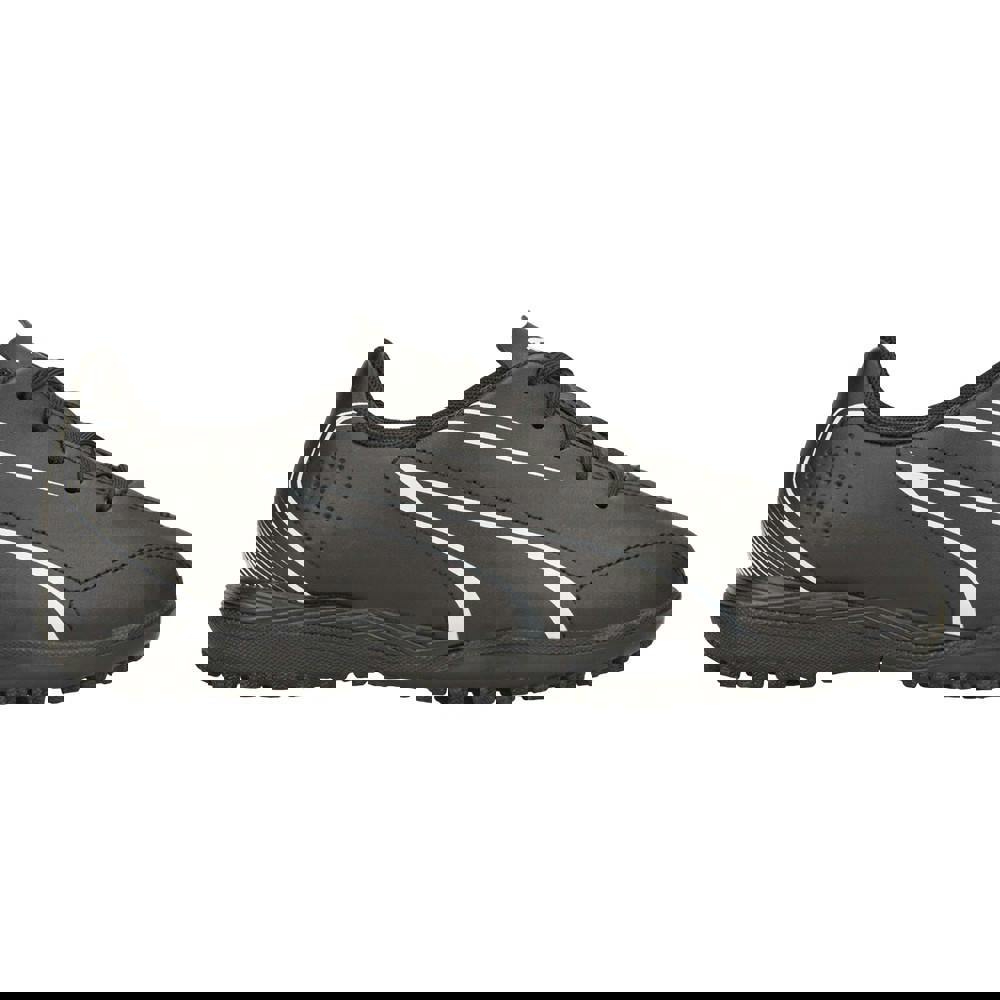 Puma Boys Vitoria TT football boots in black and white with a low-cut profile and round toe. The upper combines synthetic and textile materials, paired with a textile lining and a rubber outsole. A contrast stripe adds a clear two-tone finish, while the flat sole keeps the silhouette streamlined. The lace-up front uses six eyelets for a secure fastening, with a slip-on entry for straightforward wear.