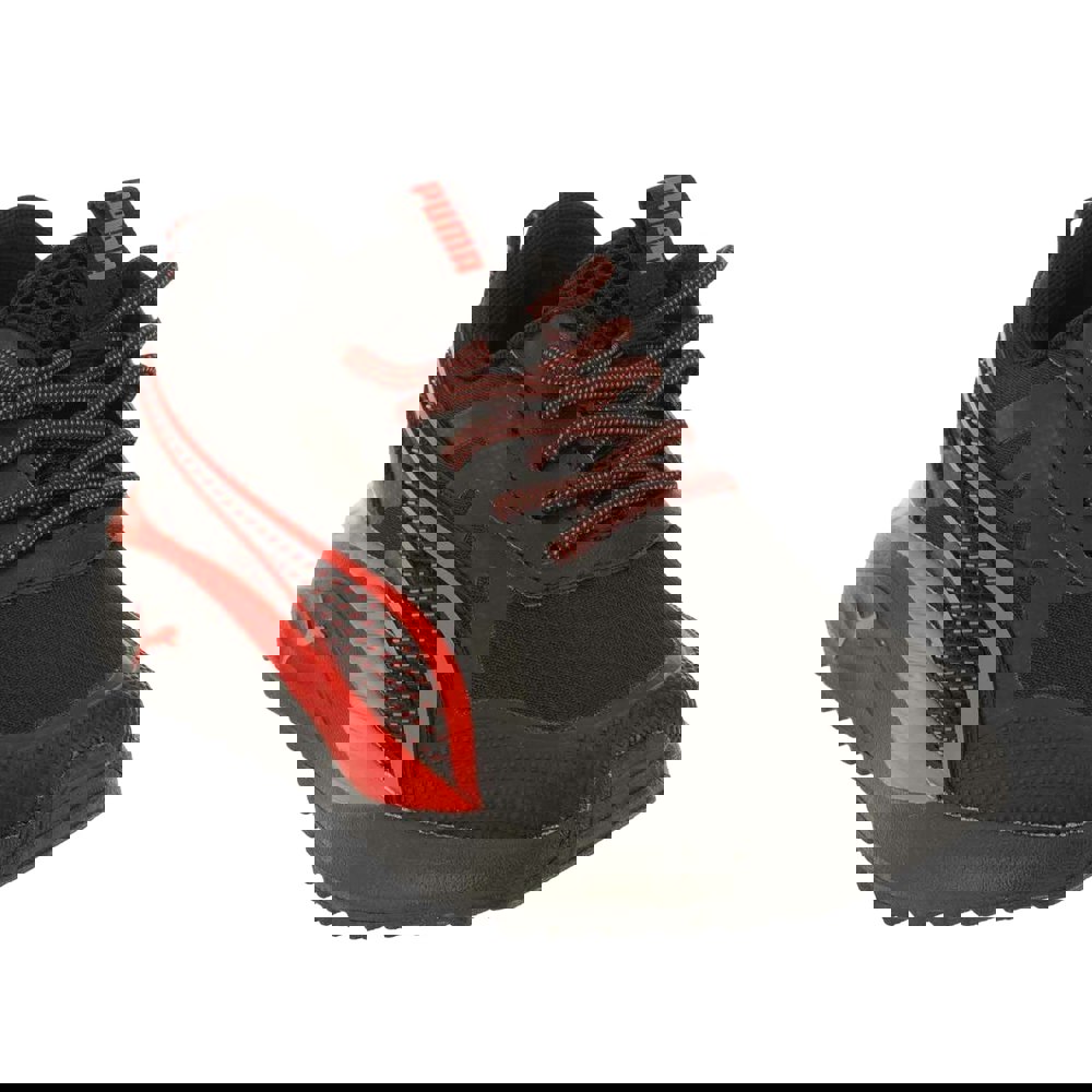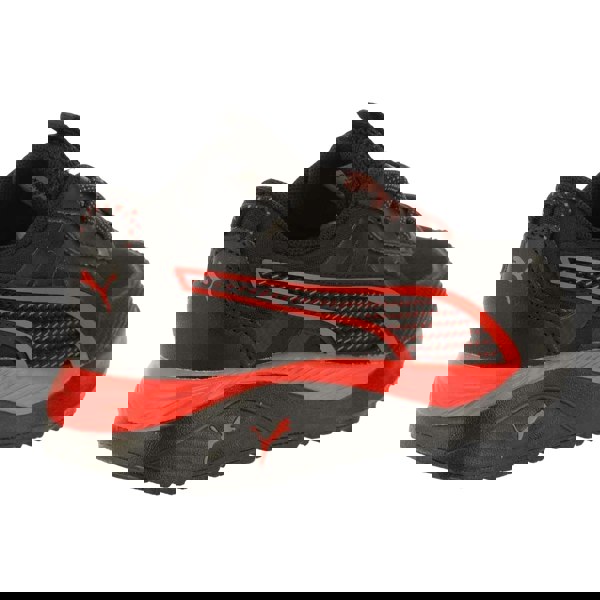 Puma Excursion trainers in black and red with a low-cut profile and a flat sole. The upper combines durable material with mesh, finished with contrast detailing, a Formstrip and logo branding. A round toe and reinforced toe section complete the front of the shoe.