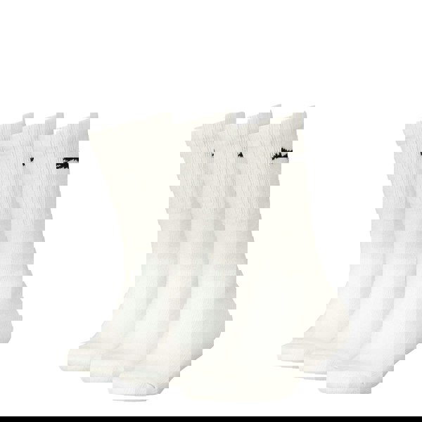 Puma childrens/kids logo crew socks come in a pack of three in white. Made from 77% cotton, 21% polyamide and 2% elastane, they use a dobby knit with a soft-touch finish. The ribbed construction and logo detailing keep the look clean and recognisable, while the flat toe seam provides a smooth finish at the front of the foot.