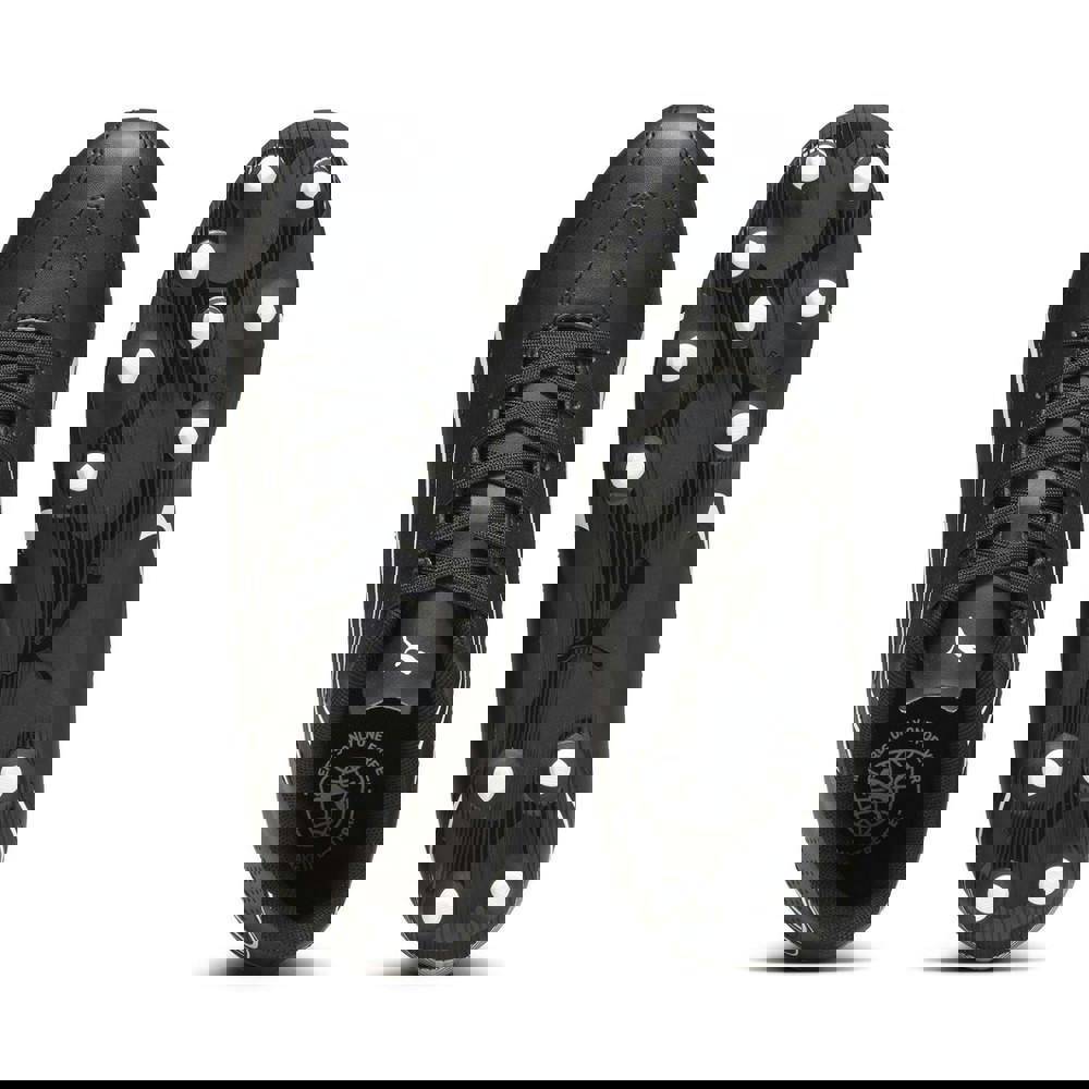Puma Vitoria football boots for children in black and white. The upper combines recycled materials with synthetic and textile, paired with a textile lining and textile sock. A padded collar and low-cut shape sit alongside a round toe and flat profile.